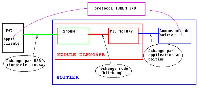 Le micro-module DLP-245PB, intégrant le controleur FT245BM et le micro-processeur 16F877, est fourni avec un ensemble de fonctions permettant les échanges entre le PC et le micro-processeur. Le protocole particulier TOKEN I/O ( document original à consulter ici ) pour ces échanges a été étendu pour les fonctions des boitiers Alpha-Kilo.![]()